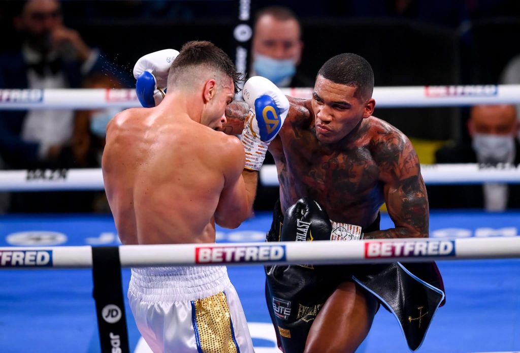 Liverpool , United Kingdom – 11 December 2021; Conor Benn, right, and Chris Algieri during their WBA Continental Welterweight Title bout at M&S Bank Arena in Liverpool, England. (Photo By Stephen McCarthy/Sportsfile via Getty Images)