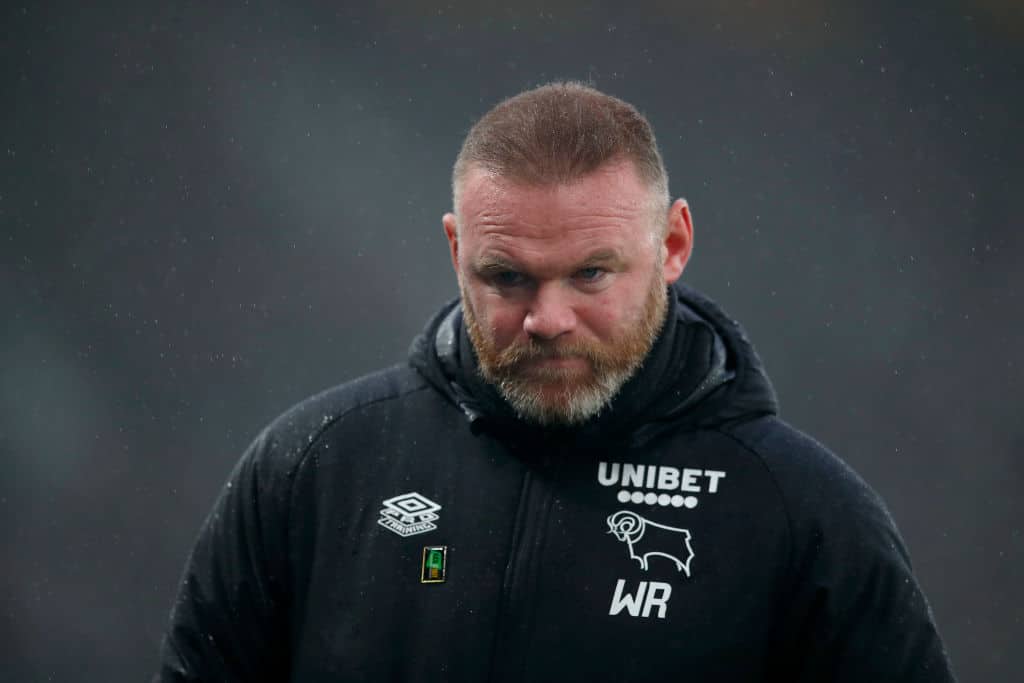 DERBY, ENGLAND – DECEMBER 27: Derby County manager Wayne Rooney looks on during the Sky Bet Championship match between Derby County and West Bromwich Albion at Pride Park Stadium on December 27, 2021 in Derby, England. (Photo by Malcolm Couzens/Getty Images)