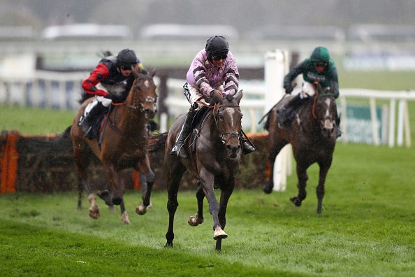 LIVERPOOL, ENGLAND – APRIL 04: Jockey Nico de Boinville riding Pentland Hills clear the last fence to win Doom Bar Anniversary 4-Y-O Juvenile Hurdle during Grand National Thursday at Aintree Racecourse on April 04, 2019 in Liverpool, England. (Photo by Michael Steele/Getty Images)
